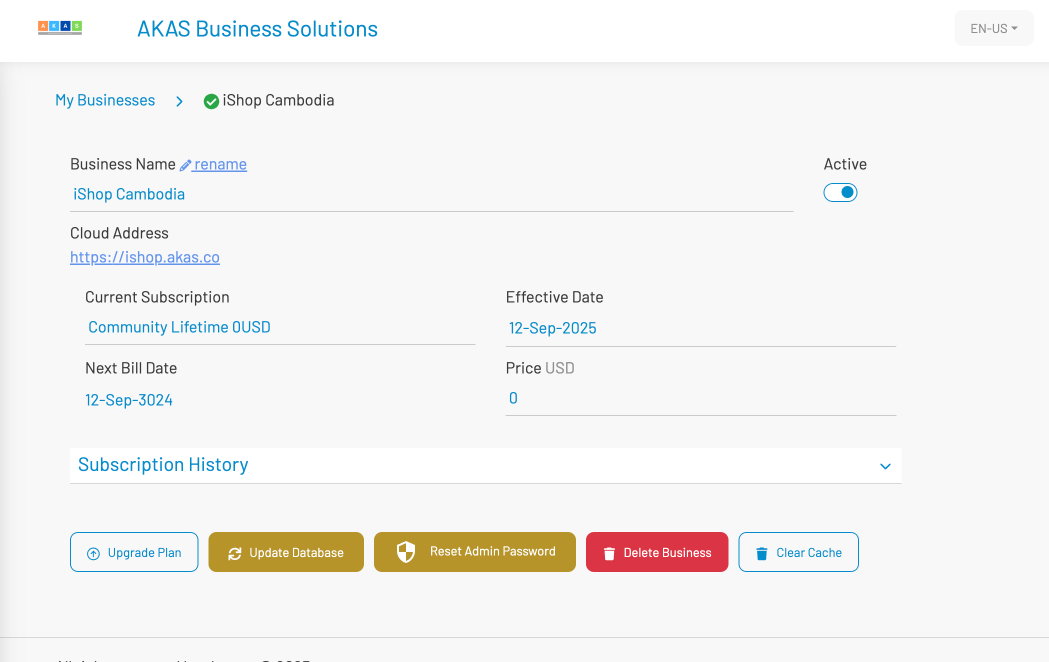 | Cloud Address | This is the live URL for your business application (e.g., https://ishop.akas.co). |