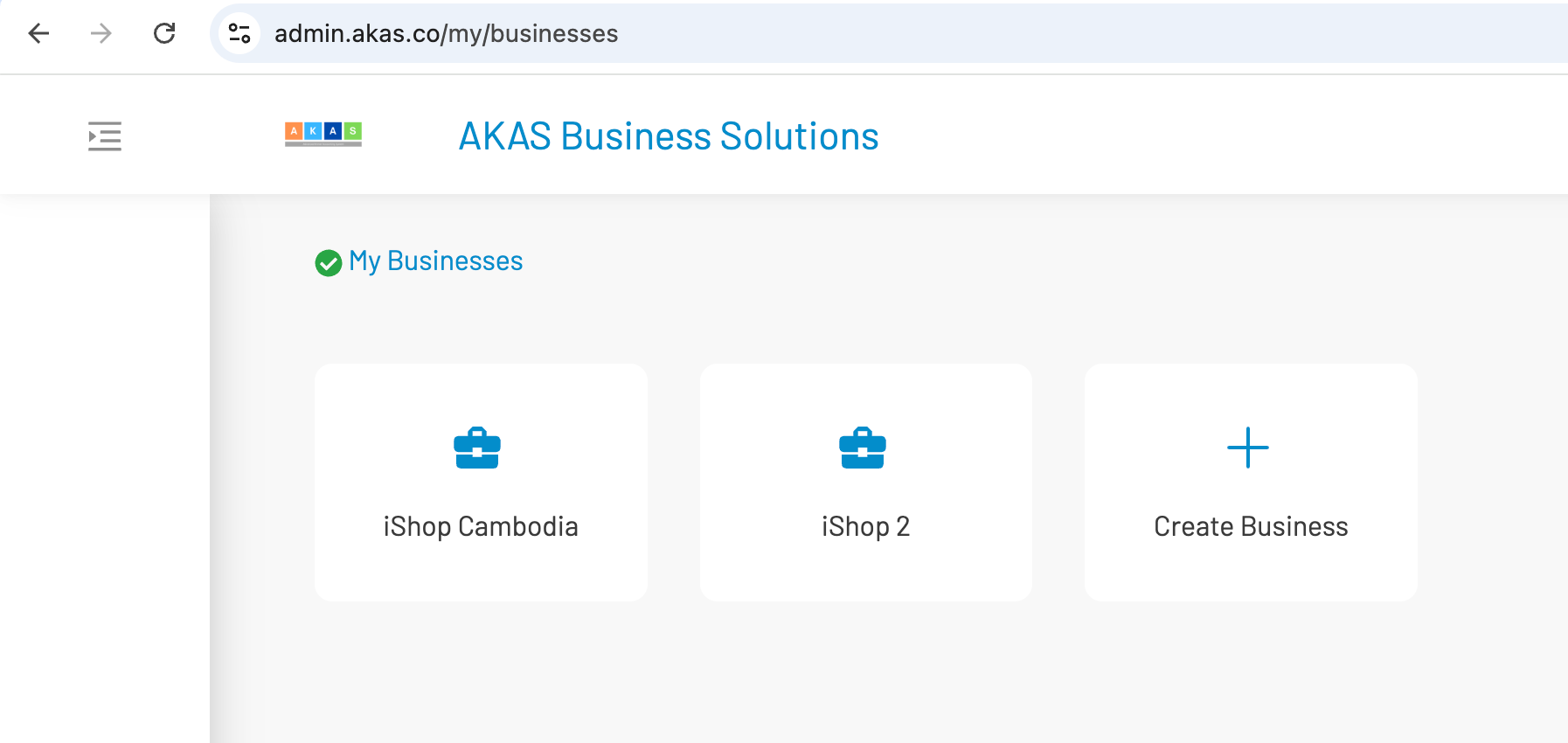 Log in and navigate to the My Businesses page. (As shown in the first image, the URL is admin.akas.co/my/businesses).