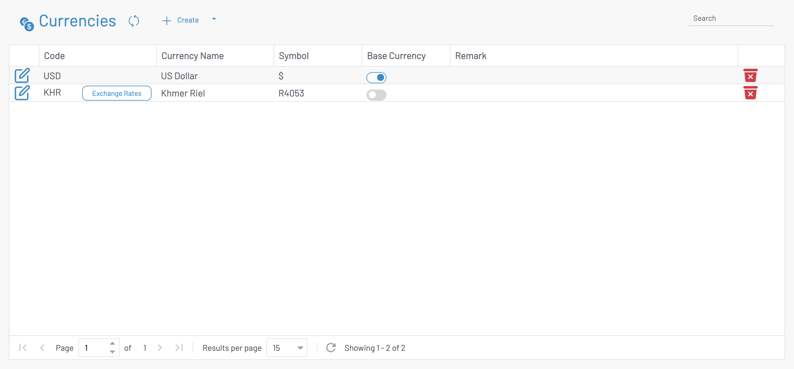 To create New Currency, click on “Create” button and it will bring up the New Currency form. Fill in the form > Click Save