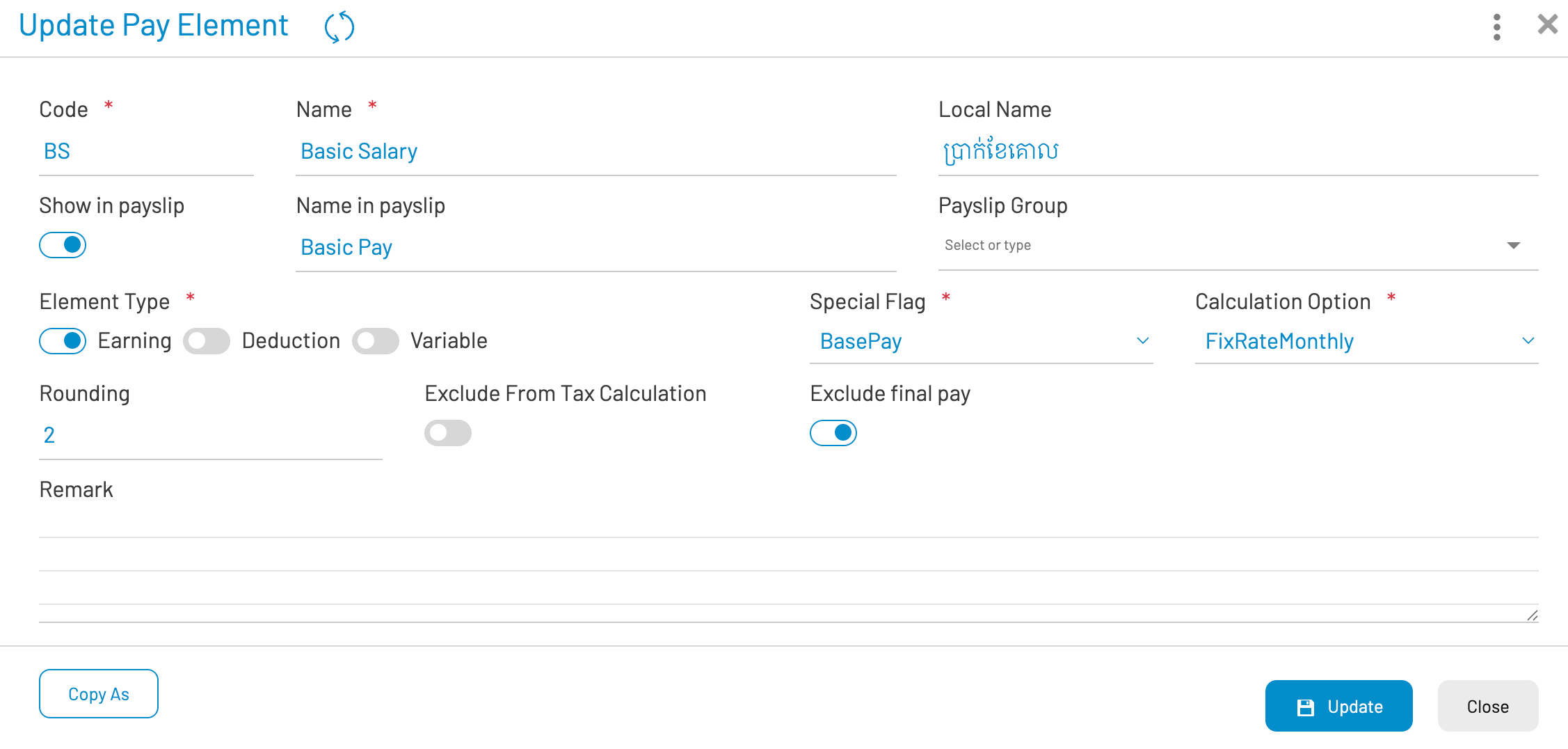 Pay element is the main component of payroll and employee benefit. Some example of pay elements are Basic Pay, Overtime, Allowances, etc. AKAS supports a very sophisticated setup of pay element to make its payroll module very flexible.