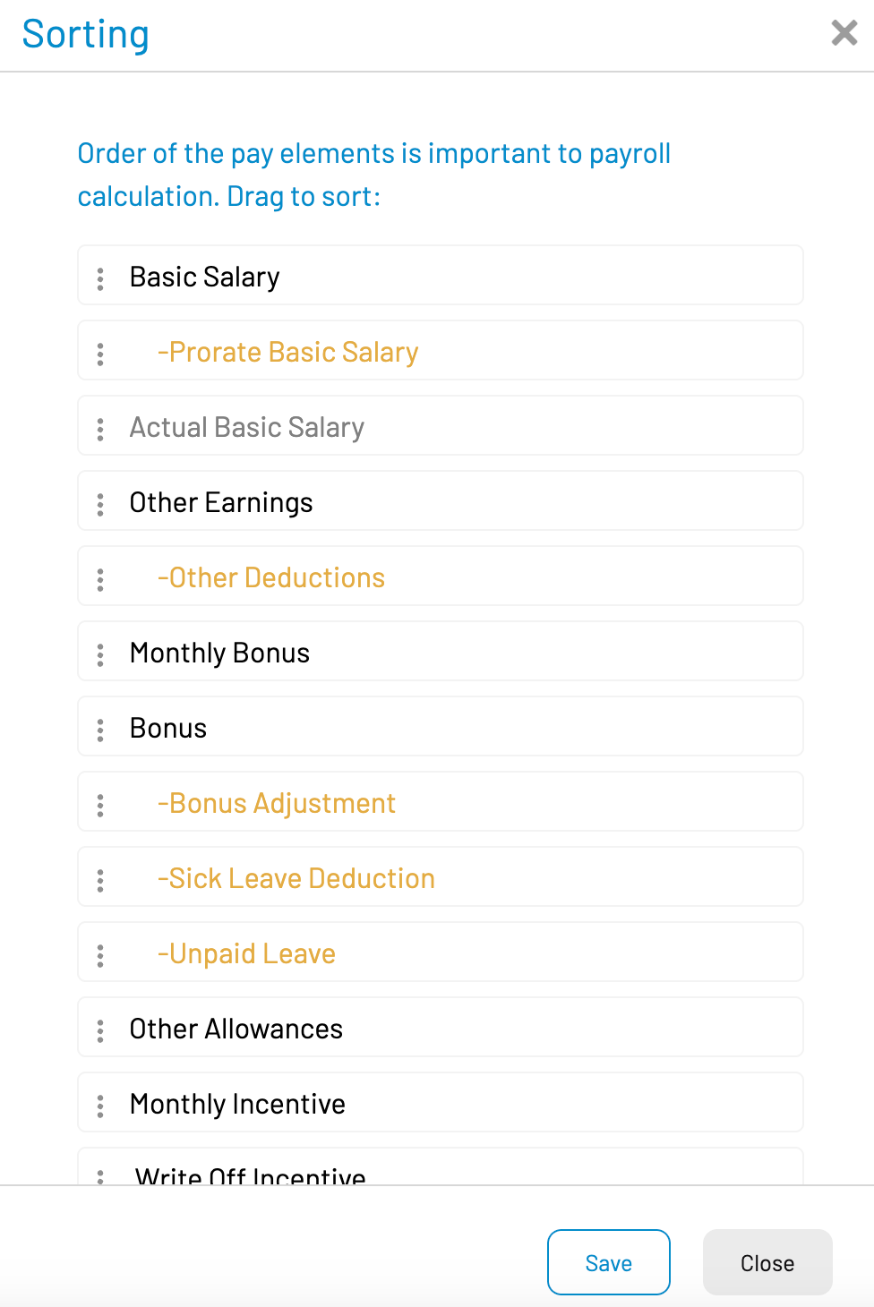 Pay elements are sorted into orders. This way enables the system calculate the next elements (i.e. formula) based on the previous ordered element amount. To arrange the pay elements order, click on Sort Pay Elements button. This screen will be popped up.