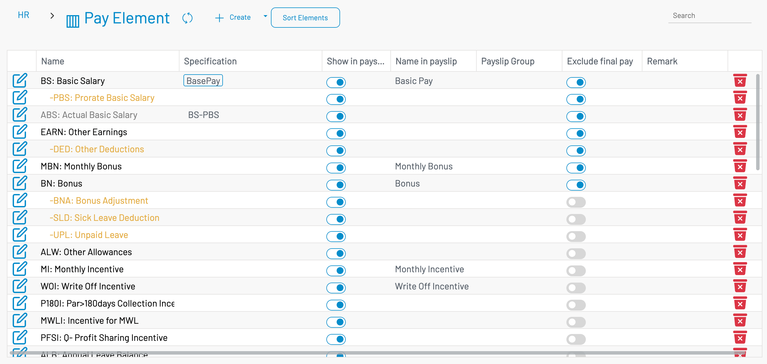 You can search using the search box, add or edit or delete pay element item using respective Add, Edit, and Delete button respectively.